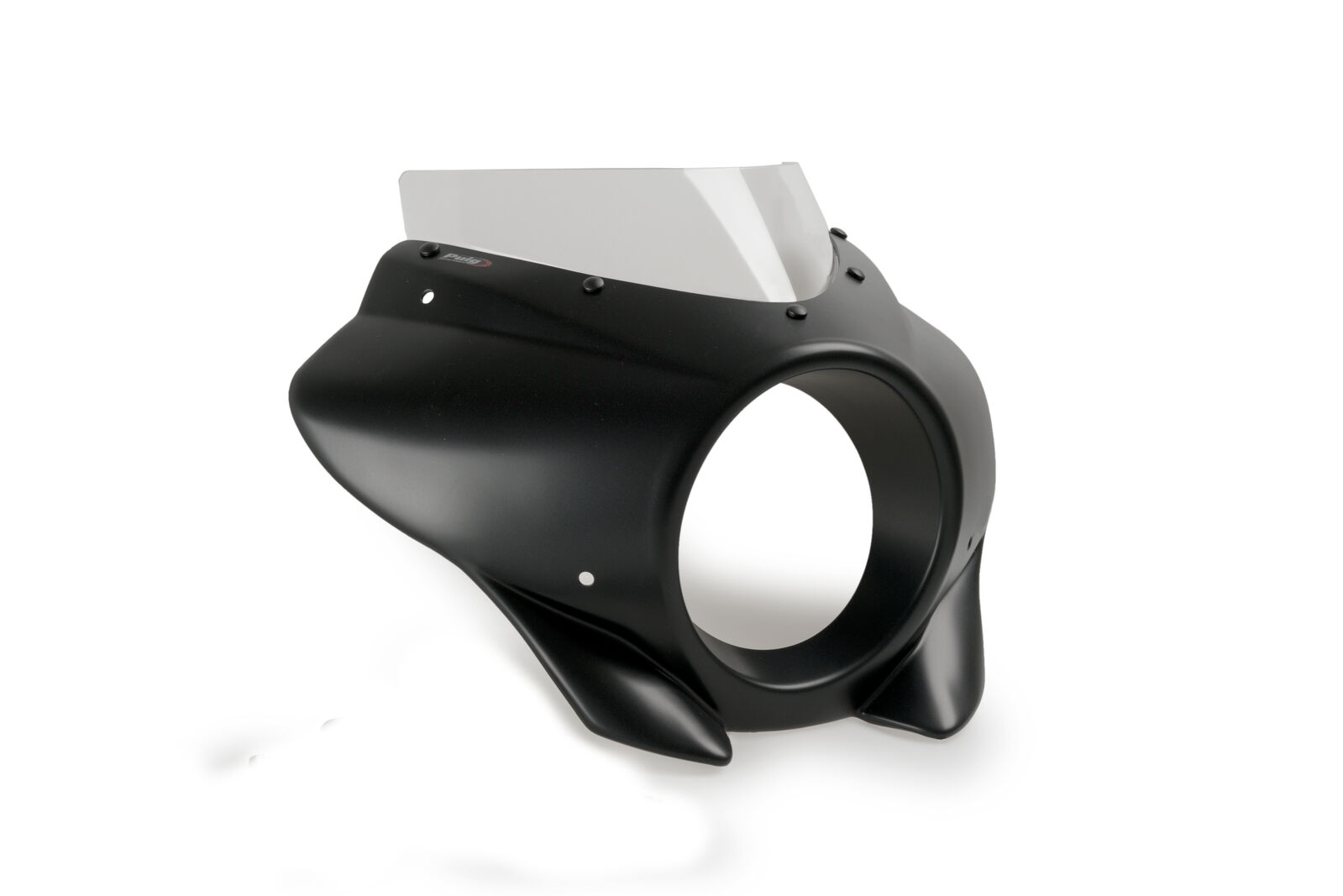 The Mirage semi-fairing is a very universal accessory since its design easily adapts to motorcycles with a round headlight, covering the front part around the headlight, protecting it from dirt and small impacts.