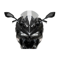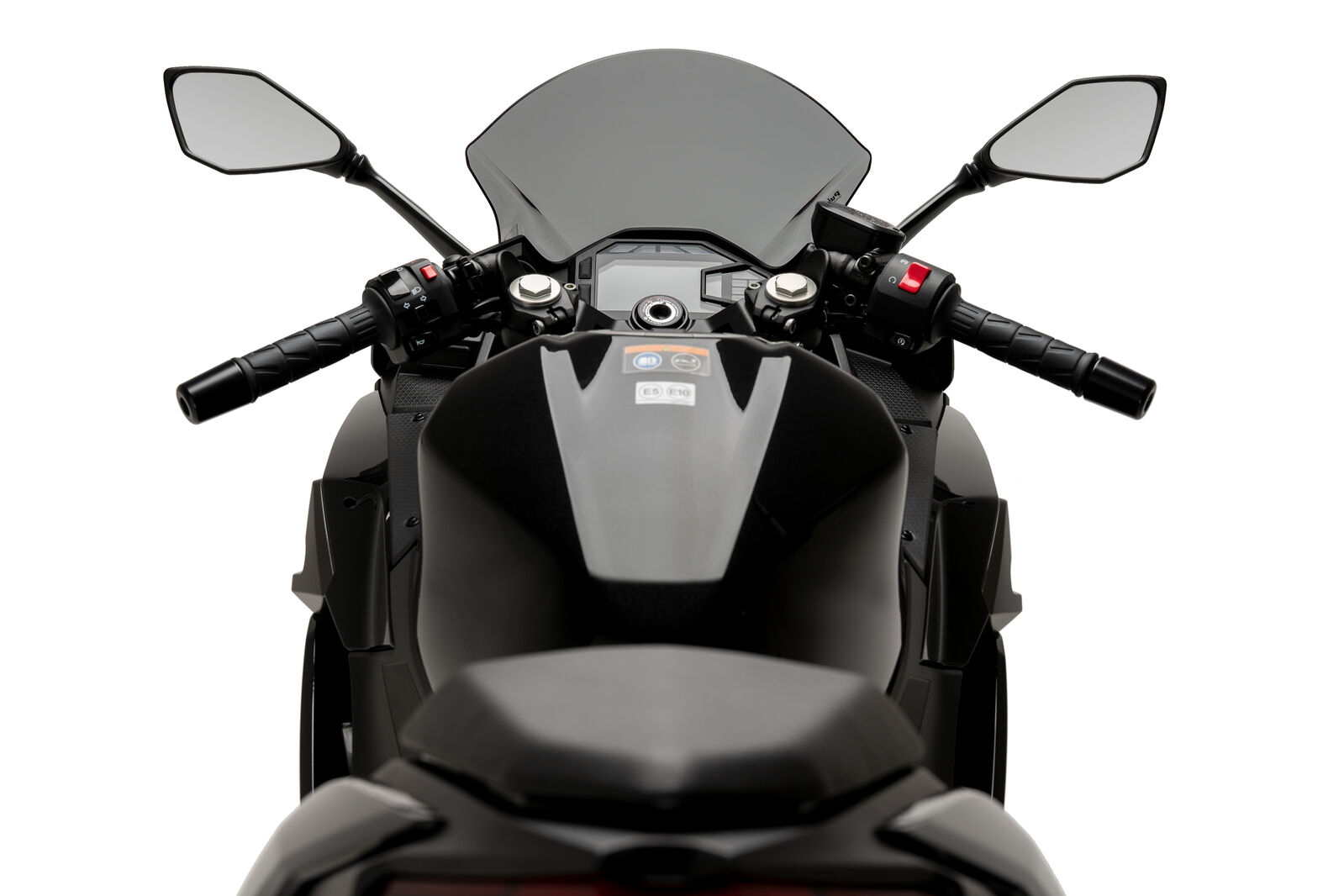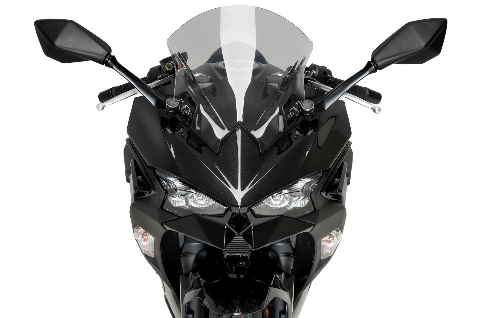This smoke coloured screen for the Ninja 500 and Ninja 500SE site 25mm higher than the original setup and has been manufactured from 3mm high impact acrylic which produces a very strong piece, light, durable and with a rounded edge of 2mm (accomplishing the safety control from the German TÜV).