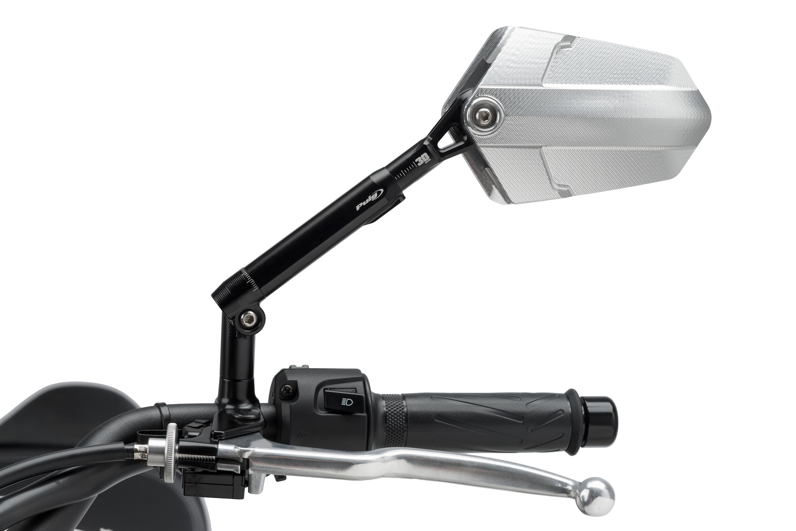 It is a piece made from machined billet aluminium, which guarantees reduced weight and the option to adjust it according to our needs, both in inclination and in extension thanks to its 4 axes of rotation and its 30 mm extension.